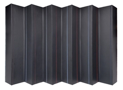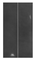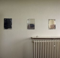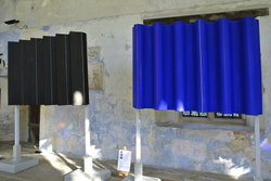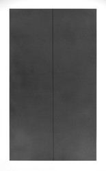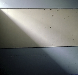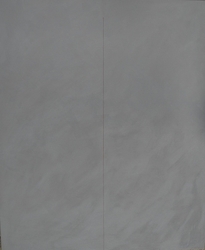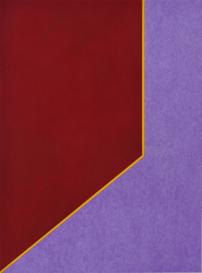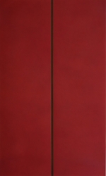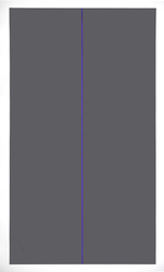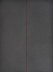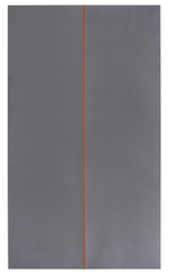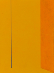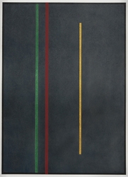 Three flat rectangular things with a stripe of colour running centrally from top to bottom, produce the effect of simultaneous contrast. Each of the central stripes is modified by the context in which ‘it finds itself’. Such stuff is commonplace. They stand, paper on aluminium, off the wall, crisp edged in the eye. What are they? They are displayed in the manner of ‘pictures’, have some pictorial attributes.